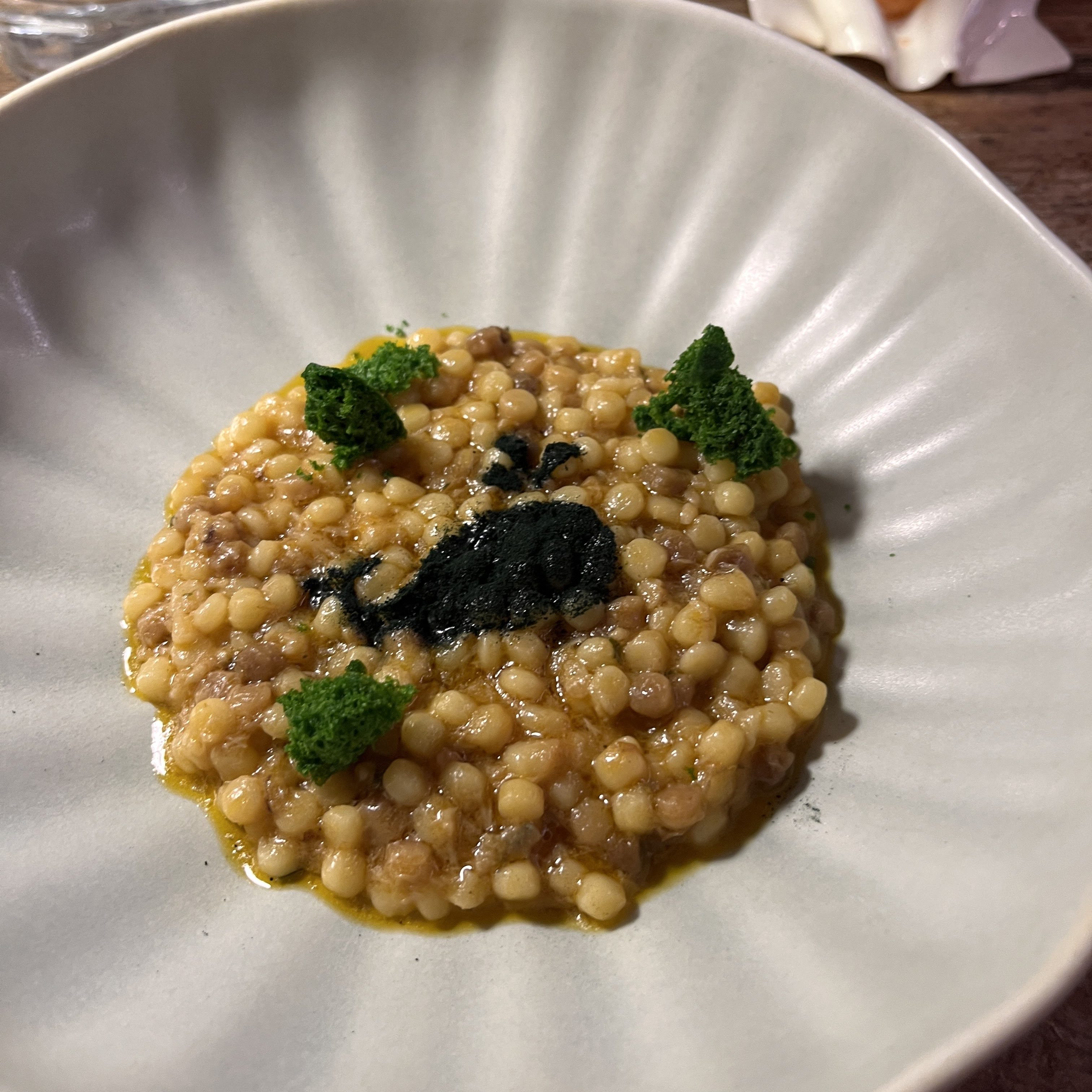 Pearl couscous style pasta in seafood broth followed, served with a pesto “sponge” and dressed with a spirulina whale. Think seafood risotto with a larger-grained pasta for the rice, but all the same depth of flavor. The pesto “sponge”…just crazy.