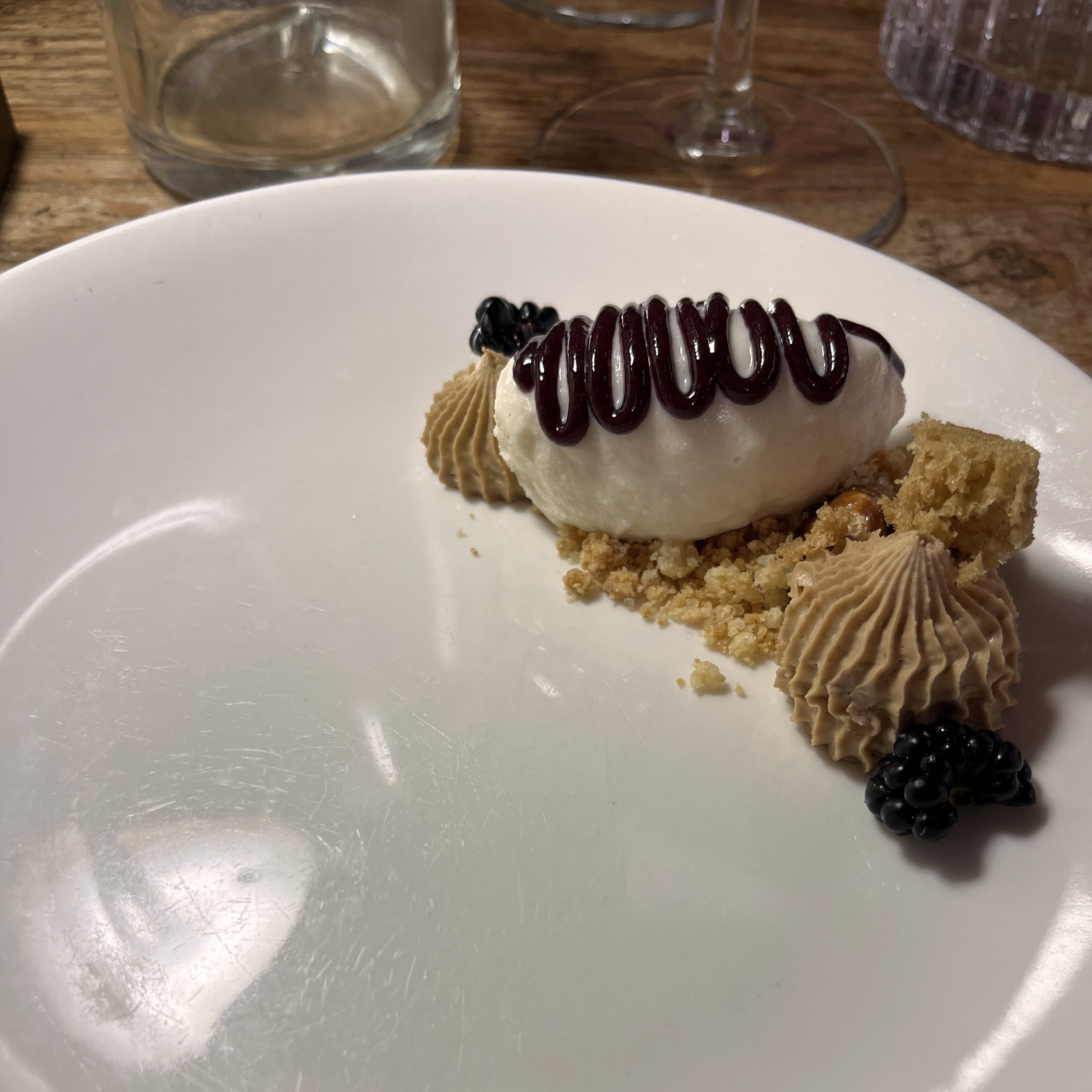 Dessert was a tangy ice cream (possibly creme fraiche?), red wine chocolate sauce, brown sugar crumb cake, caramel mousse designed like shells on a beach, and a couple blackberries. The caramel sweetness was the perfect counter-point to the sour tang of the ice cream.
