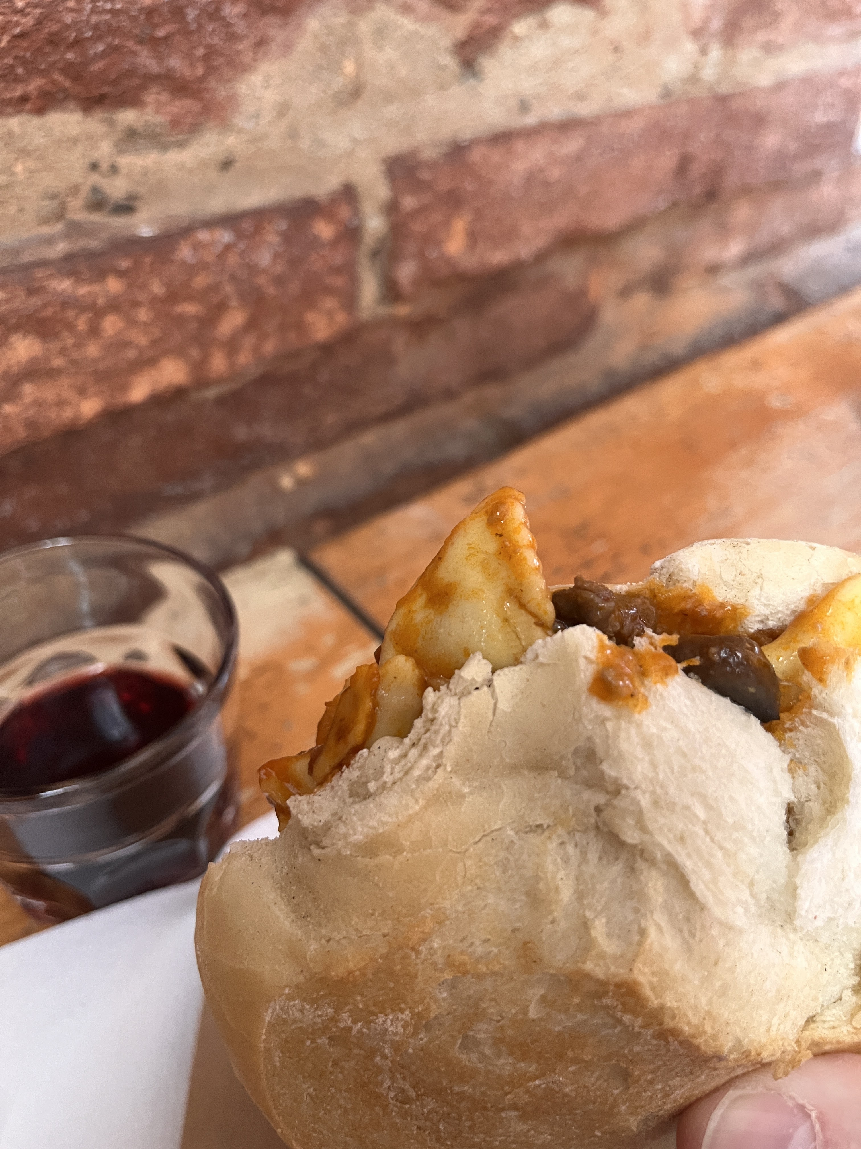 I had a sandwich of wild boar ragu with ravioletti (small ravioli) and the house wine. Unless you have already discovered the Spaghetti Grilled Cheese, the idea of pasta on a sandwich may seem strange. The roll was a traditional Tuscan bread, which is unsalted, but the wild boar ragu was stunningly flavorful and the ravioletti the perfect addition of cheese. It was like comfort food from a childhood I never lived.