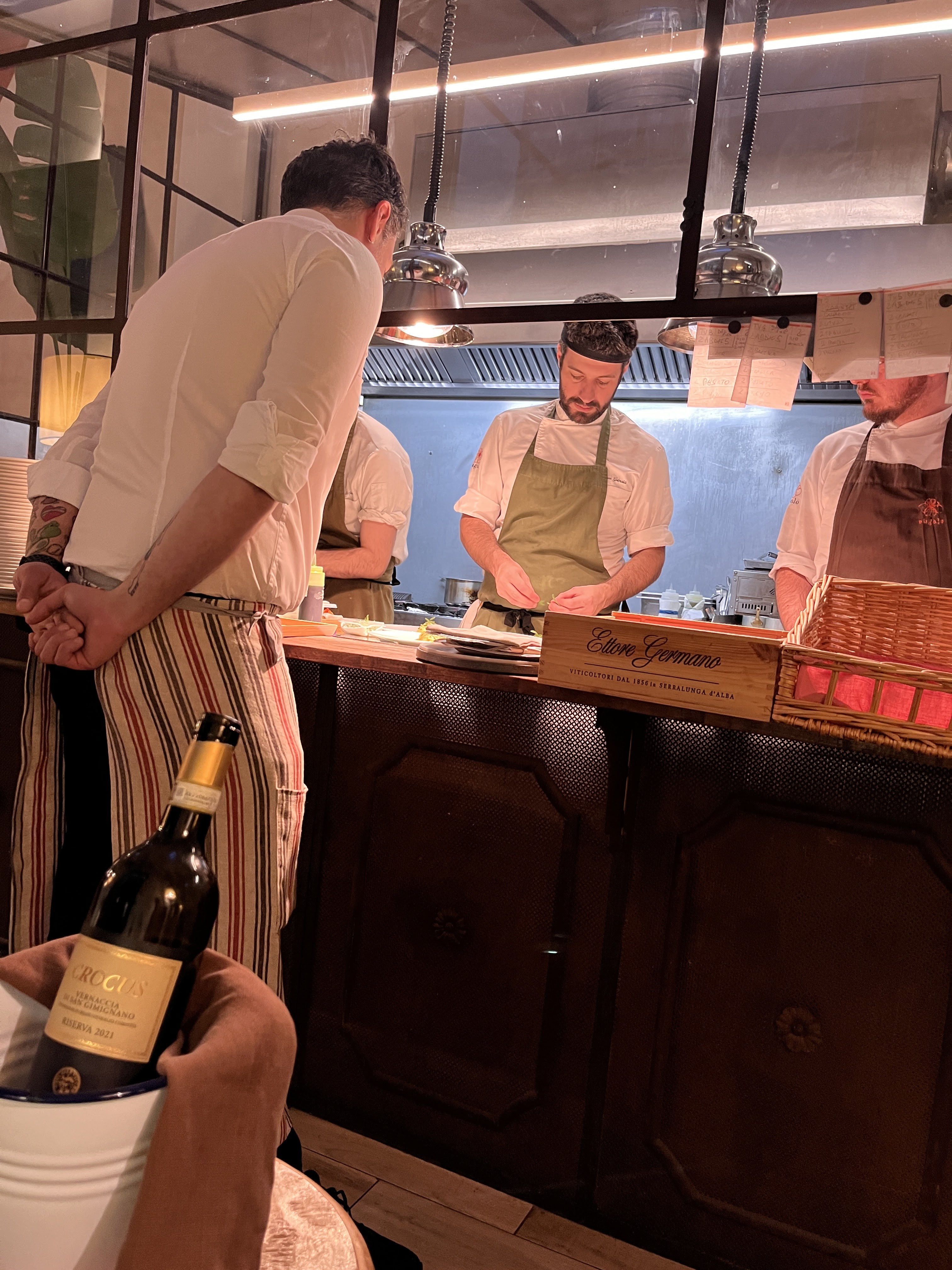 If Semel was the soul of comfort food, the tasting menu at that evening at Nugolo was the triumph of imagination. Nugolo was featured on episode 5 of Stanley Tucci’s TV series, Searching for Italy. The space is unassuming, a thin room with a glass kitchen that allows guests to peer in as they pass. We were fortunate enough to be seated right across from the kitchen to witness all the magic happen.