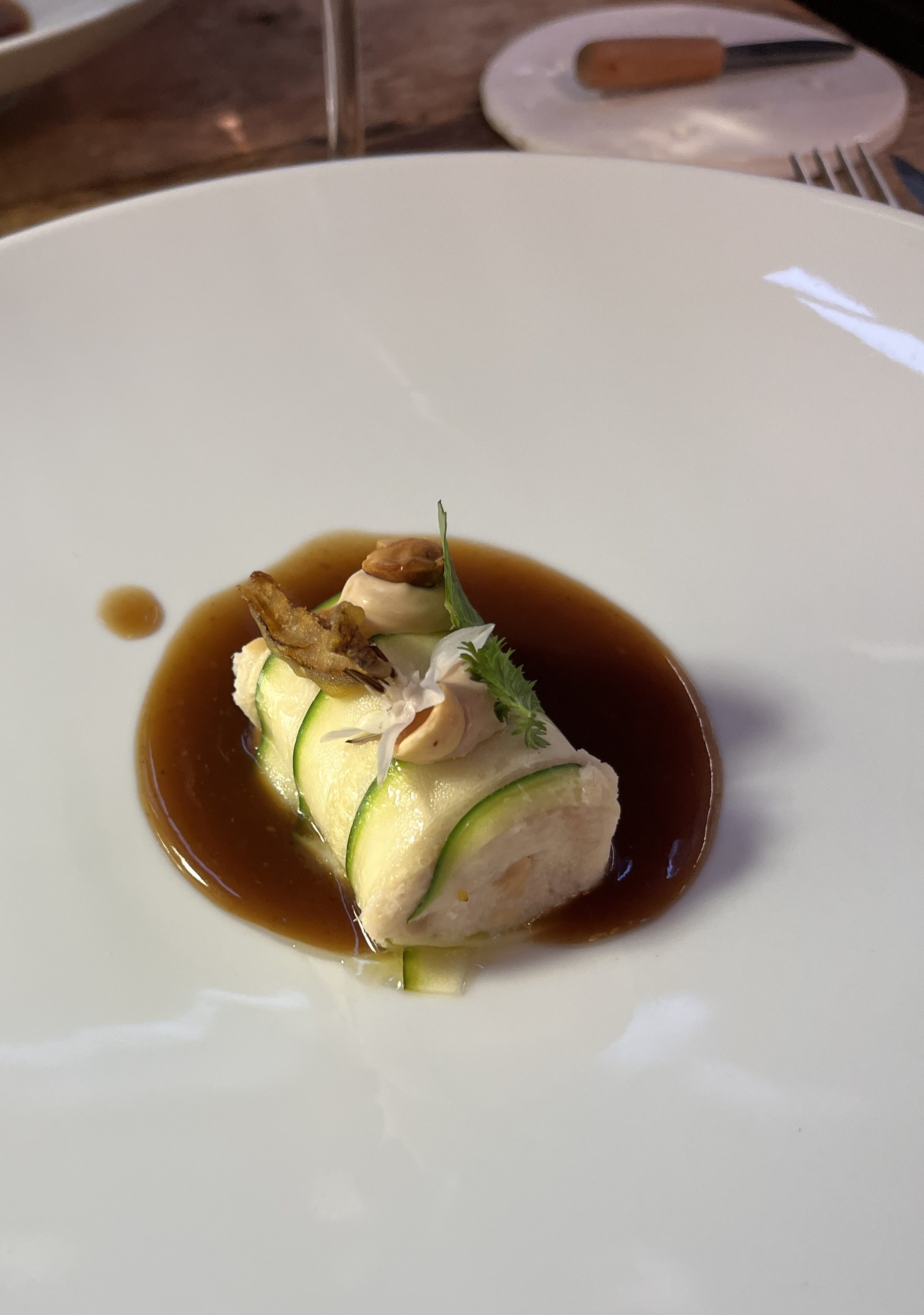 The first dish of the tasting was cod mousse wrapped in a thin, poached zucchini on a red onion broth reduction topped with a fried zucchini flower and an edible flower. Conceptually, prepared like a manicotti, but in in flavor, something all together new. The depth of umami, roasted flavor in the red onion reduction was a lovely, rich counterpoint to cod mousse.