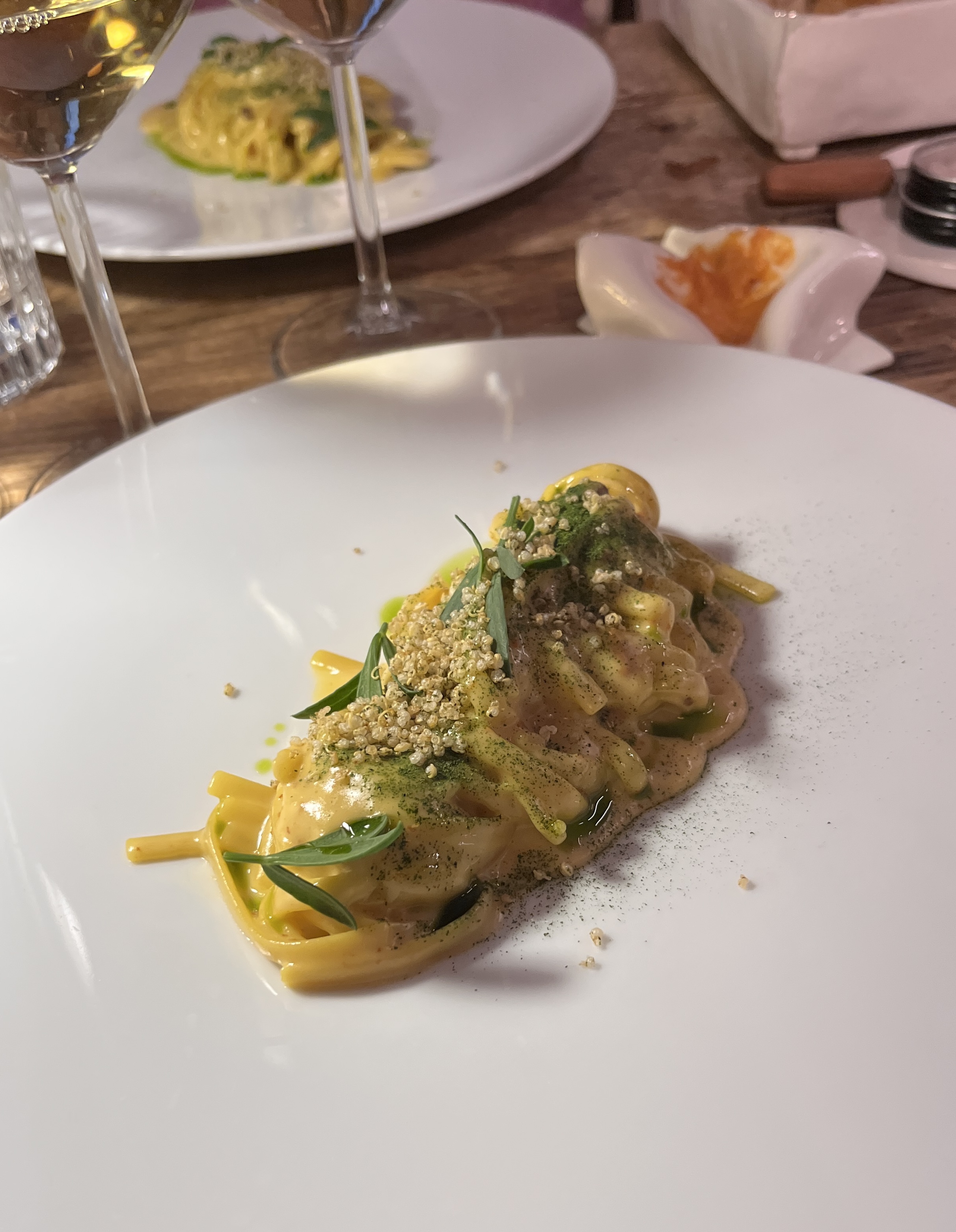 Next was a linguine with sea urchin cream sauce. Yes, a sea urchin cream sauce! A bit of puffed couscous, tarragon, and an herb oil finished the dish.