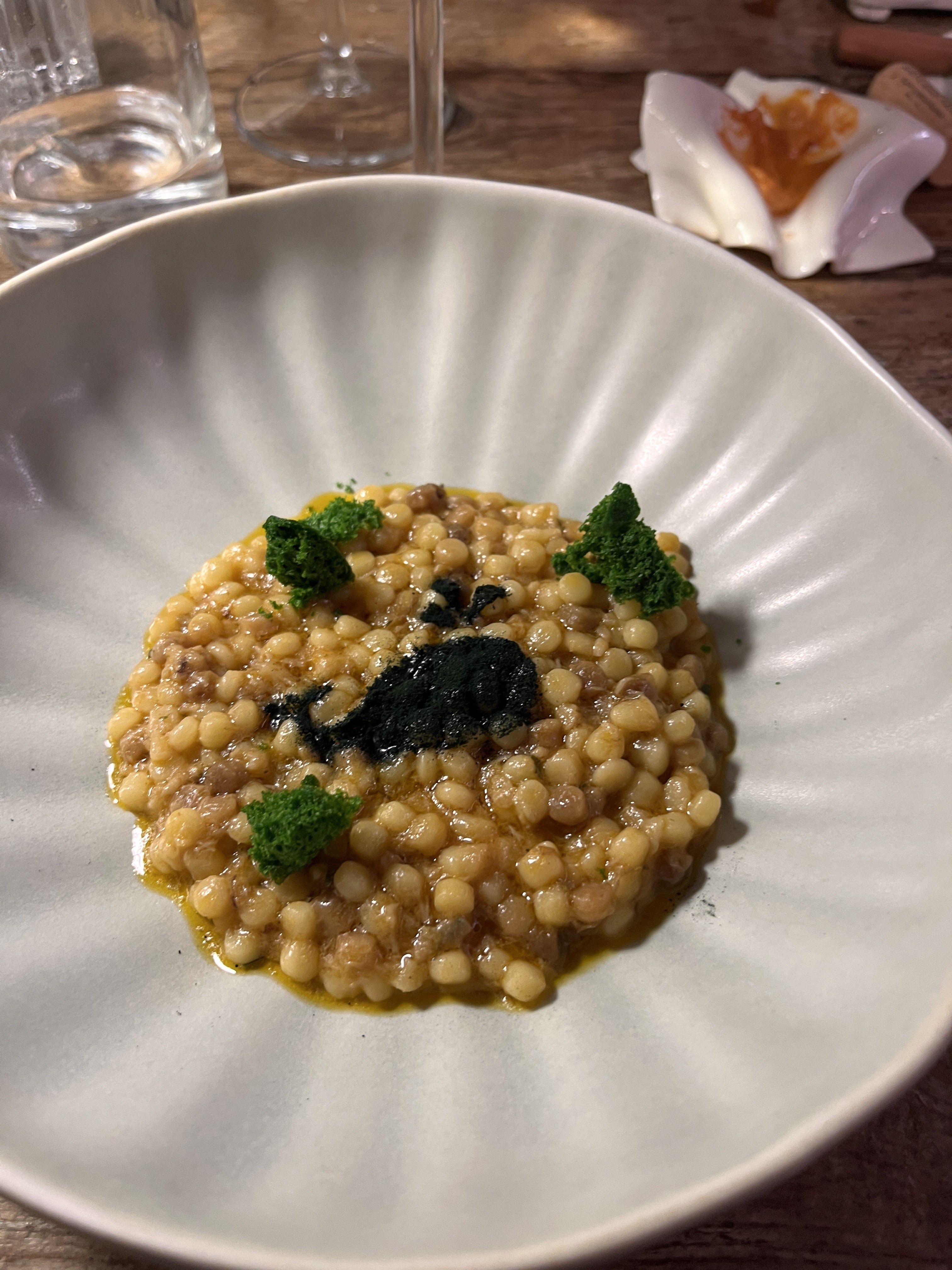 Pearl couscous style pasta in seafood broth followed, served with a pesto “sponge” and dressed with a spirulina whale. Think seafood risotto with a larger-grained pasta for the rice, but all the same depth of flavor. The pesto “sponge”…just crazy.