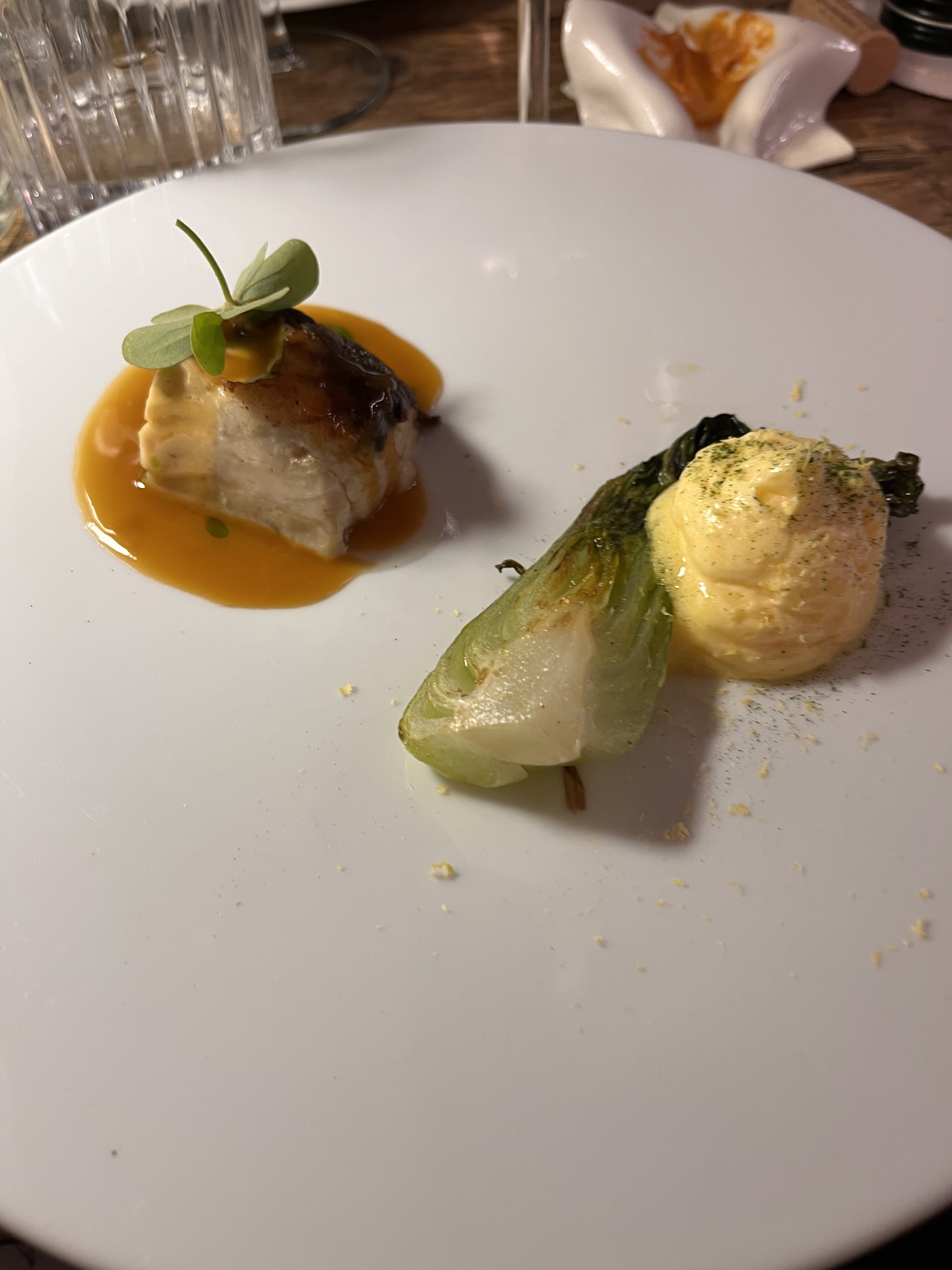The poached sea bass, ginger reduction, sorrel and bok choy with bearnaise foam, lemon zest, herb powder. Making the bearnaise a foam lightened in texturally but also seemed to brighten the flavor.