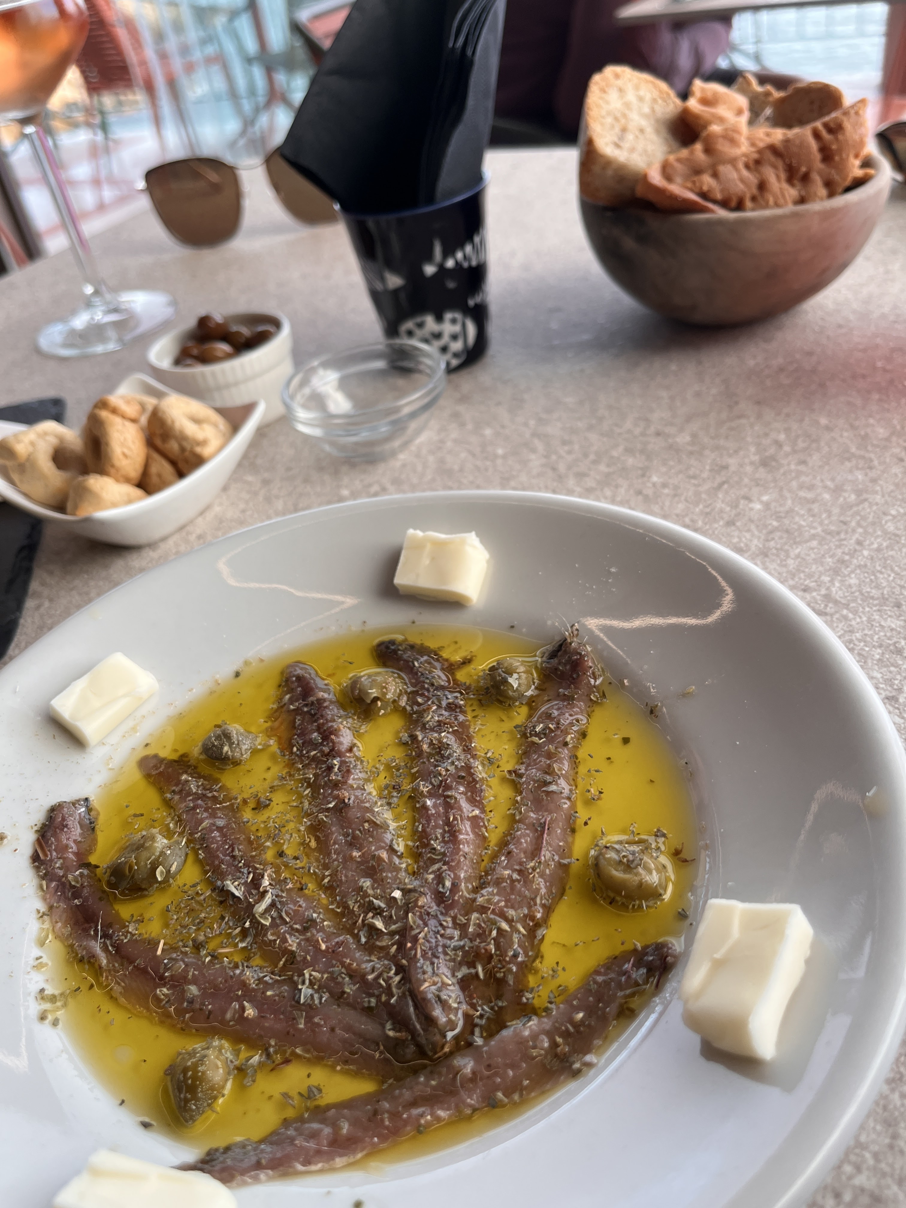 Salt-cured anchovies were served in a pool of fresh, local olive oil, with capers, dried herbs, and butter, along with various breads. A bite of the bread, spread with butter and topped with a preserved anchovy is a pure delight. A burst of salty fish, then mellowed with the creamy buttered bread.