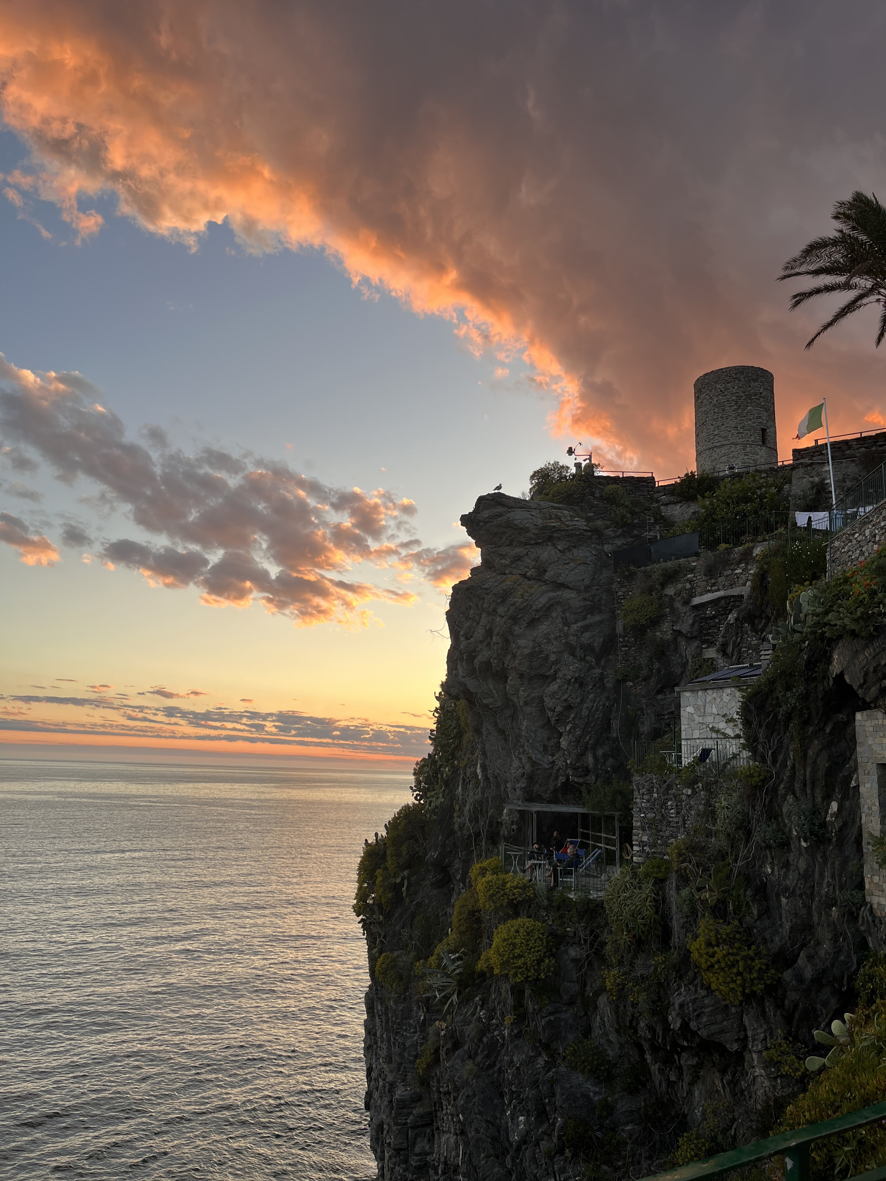 And as the sun sets and the second glass of wine is finished, we linger a moment longer, for how can you not linger? The clouds display their colors, waves roll to the cliffside rocks, and we linger. Finally, slowly, we descend the steps back down to the streets of Vernazza and find a small cafe.