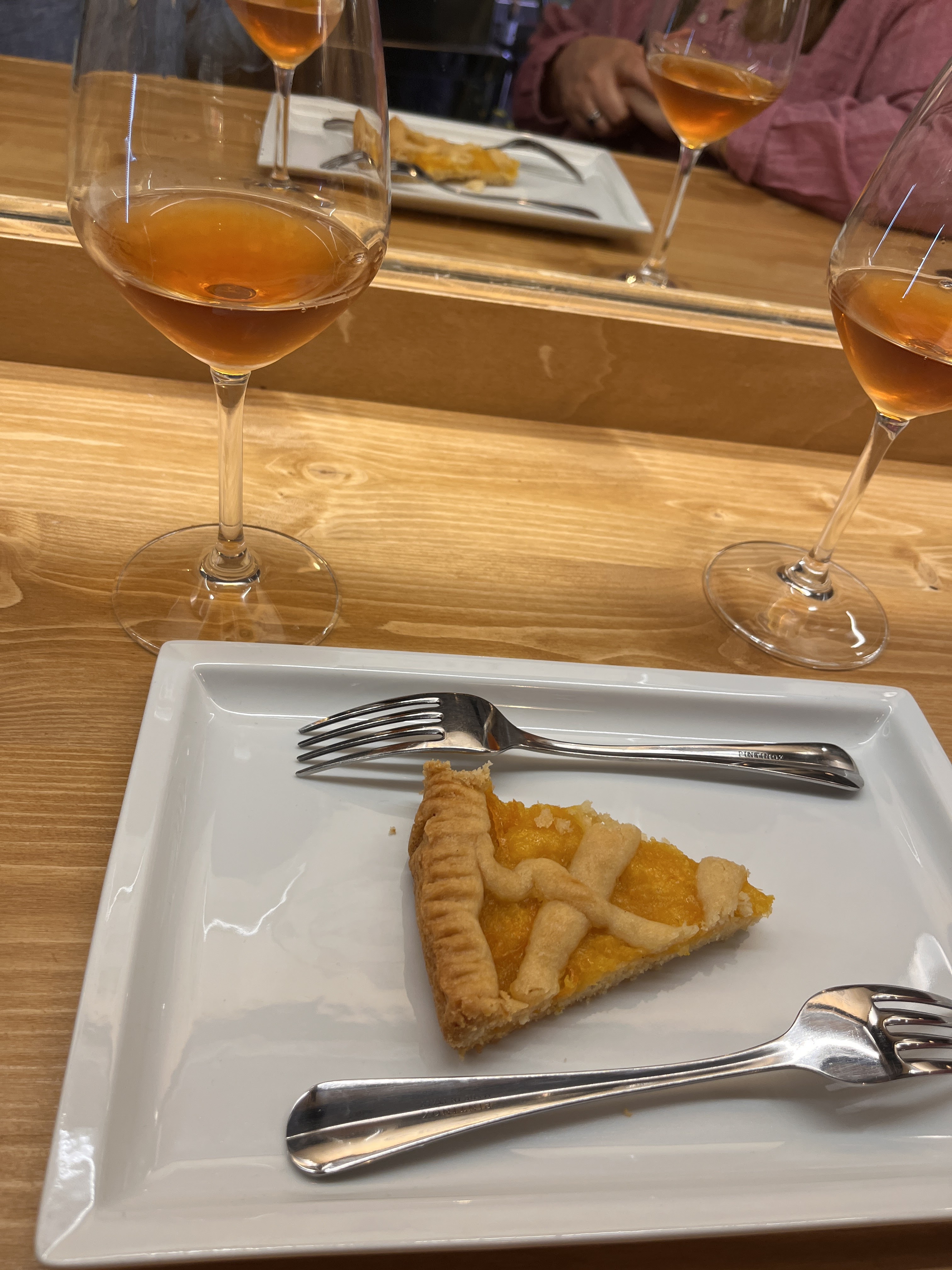 An orange tart shot through with pieces of orange rind alongside a La Polenza Sciacchetrà bring a day of oceanside sun to a close. Sciacchetrà is a locally produced dessert wine which manages to taste citrusy despite, or perhaps because of, the tart. Not orange, maybe lemon? But subtle, a hint of just the zest? And this again was mere prelude to the epic events of the day to come.