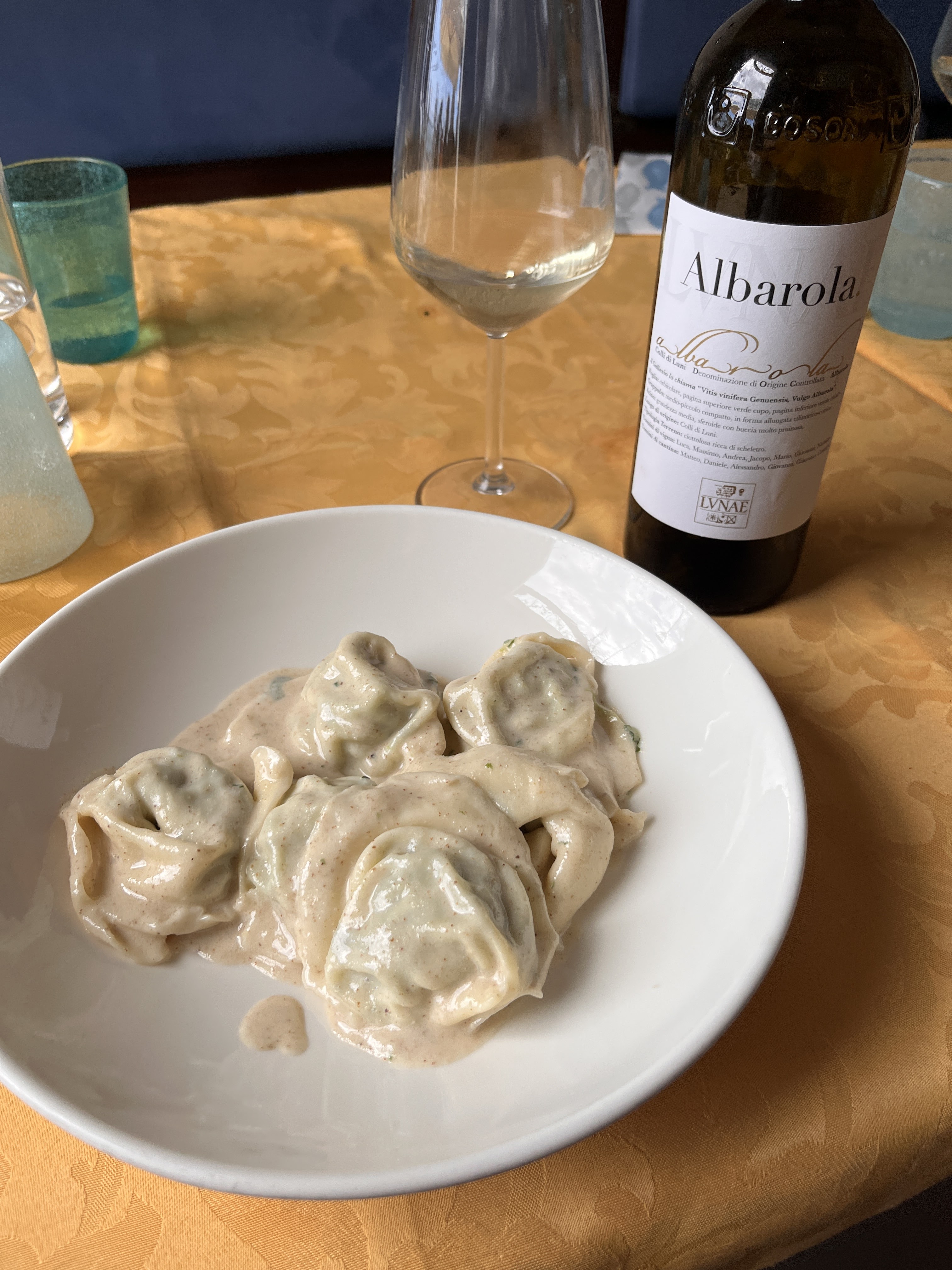 For this meal, we were meeting her husband’s family for his birthday and we started with a few bottles of Albarola, a crisp, refreshing white wine from Cantine Lunae and then a few more. The tasting notes from the producer talk about a medium, but persistent finish with hints of lime zest. Ah, there is that citrus note I’ve been searching for in the wine from the previous night.