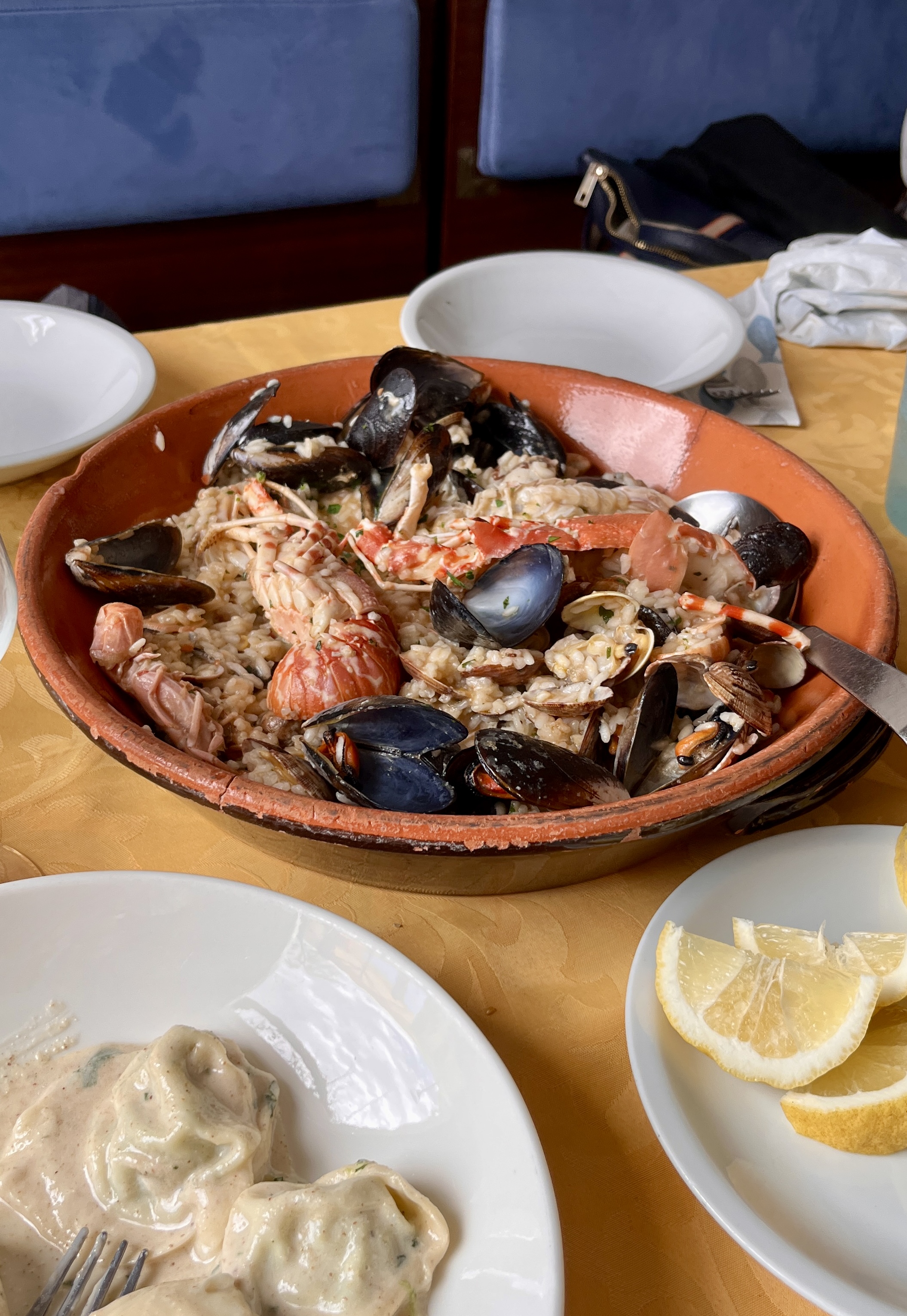 And then seafood risotto with small local lobster (perhaps Mediterranean spiny lobster?), mussels, tiny local clams, and scampi over rice with the perfect texture, each grain soft, but distinct and full of seafood flavor.