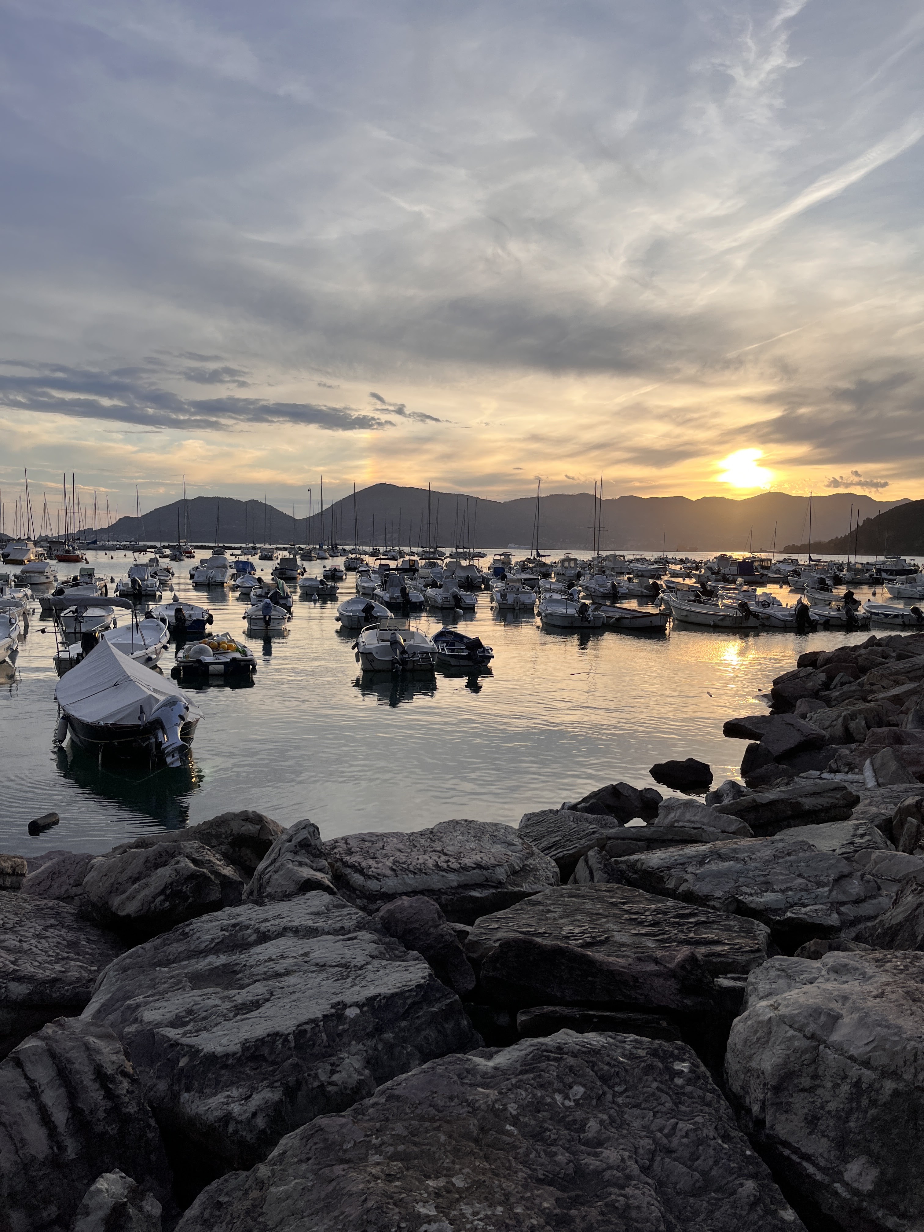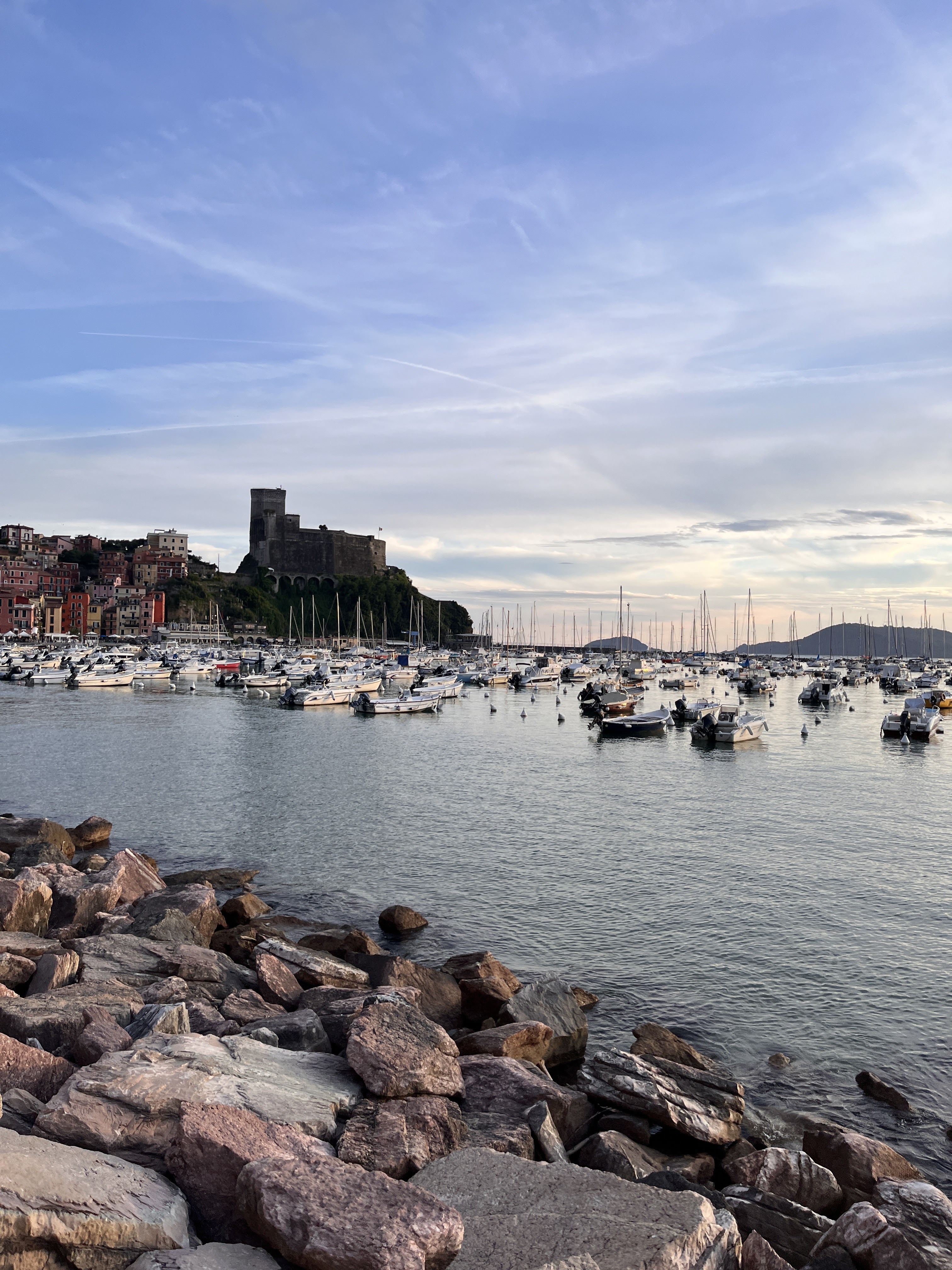 There, that castle across the idyllic bay, where the anchored sailboats gently bob on the waves, that is where we’re headed, originally built in 1152 to control the Gulf of La Spezia.